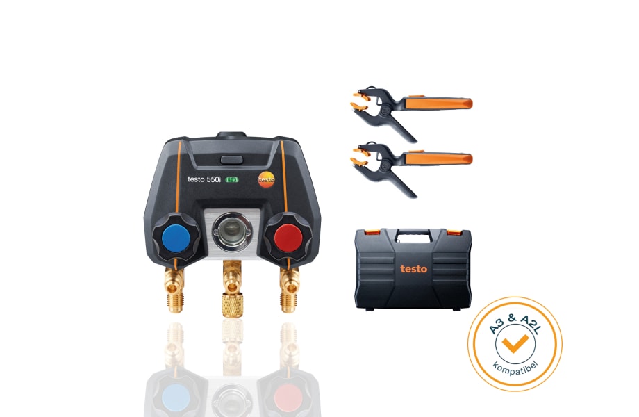 Das Set für App-gesteuerte, kabellose Messungen und digitale Dokumentation auf Ihrem Smartphone. Sie erhalten die App-gesteuerte digitale Monteurhilfe testo 550i inkl. Bluetooth, 2-Wege Ventilblock und stabilem Haken, zwei kabellose Zangen-Thermometer testo 115i (Bluetooth, NTC) und einen robusten Transportkoffer. Für weitere drahtlose Messungen sind die optional erhältlichen Testo Smart Probes für Temperatur, Feuchte und Vakuum eine ideale Erweiterung. So sind Sie bestens gerüstet für Ihre Messaufgaben an Kälte- und Klimaanlagen sowie Wärmepumpen.