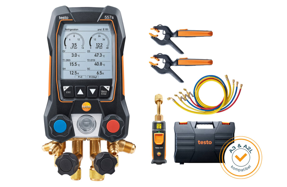 Für komplett kabellose Messungen an Kälte- und Klimaanlagen sowie Wärmepumpen. Dank der mitgelieferten Bluetooth-Vakuumsonde können Sie sogar Vakuum ohne Kabel und Schlauch messen. Sie erhalten die smarte digitale Monteurhilfe testo 557s inkl. Bluetooth und 4-Wege Ventilblock, eine kabellose Vakuumsonde testo 552i (Bluetooth), zwei kabellose Zangen-Thermometer testo 115i (Bluetooth, NTC), 4er-Füllschlauchsatz und einen robusten Transportkoffer. Für weitere drahtlose Messungen sind die Testo Smart Probes ideal.