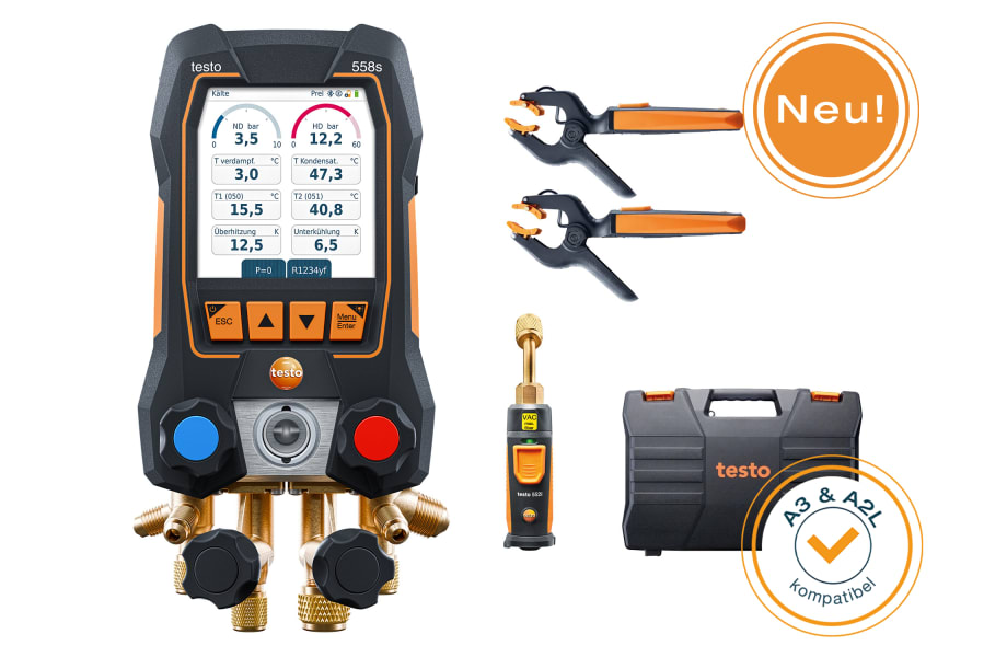 Starten Sie sofort mit Ihren kabellosen Messungen an Kälte- und Klimaanlagen sowie Wärmepumpen. Das praktische Set mit der digitalen Monteurhilfe testo 558s mit Bluetooth-Anbindung zu den kabellosen Temperatur- und Vakuum-Sonden bietet die idealen Tools für alltägliche Aufgaben. Das testo 558s ermöglicht dank Touchscreen und übersichtlichen Messgrafiken auf großem Farbdisplay eine intuitive Bedienung. Neben dem Touchscreen kann die Monteurhilfe für das Arbeiten mit Handschuhen zusätzlich über Tasten bedient werden. Dank A3 und A2L Kompatibilität, hoher Robustheit mit IP 54 und hybriden Ladesystem aus Akku und Batterien ist die Monteurhilfe für jede Situation optimal geeignet.