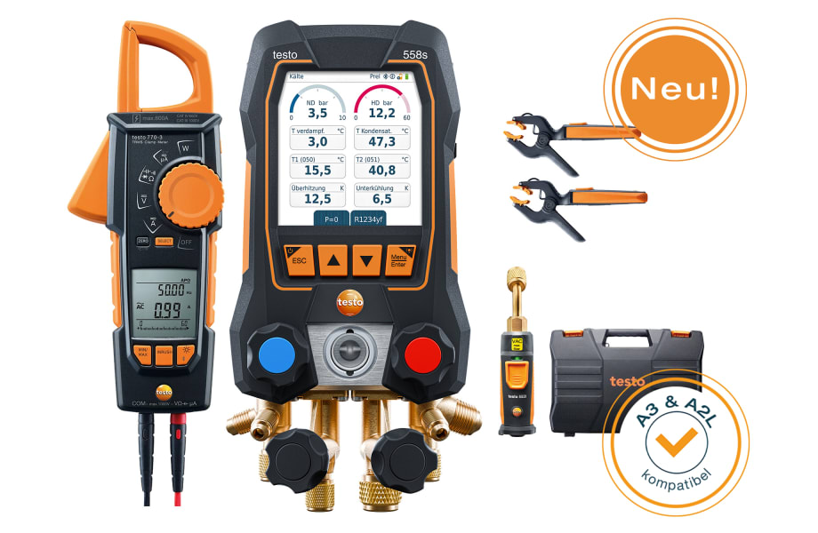 Starten Sie sofort mit Ihren kabellosen Messungen an Kälte- und Klimaanlagen sowie Wärmepumpen. Das praktische Set mit der digitalen Monteurhilfe testo 558s mit Bluetooth-Anbindung zur Stromzange sowie zu den Temperatur- und Vakuum-Sonden bietet die idealen Tools für alltägliche Aufgaben. Das testo 558s ermöglicht dank Touchscreen und übersichtlichen Messgrafiken auf großem Farbdisplay eine intuitive Bedienung. Neben dem Touchscreen kann die Monteurhilfe für das Arbeiten mit Handschuhen zusätzlich über Tasten bedient werden. Dank A3 und A2L Kompatibilität, hoher Robustheit mit IP 54 und hybriden Ladesystem aus Akku und Batterien ist die Monteurhilfe für jede Situation optimal geeignet.