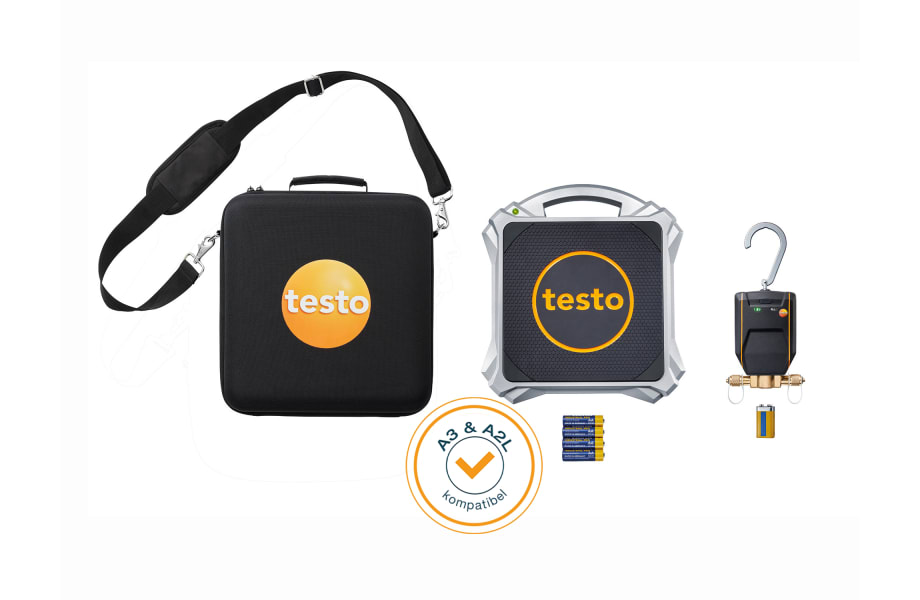 • Im Set: digitale Kältemittelwaage testo 560i und intelligentes Ventil (beide mit Bluetooth), Umhängetasche, Batterien