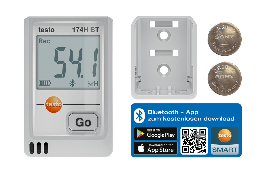 Der Mini-Datenlogger testo 174 H BT eignet sich zur Überwachung bei der Lagerung von temperatur- und feuchteempfindlichen Gütern wie Lebensmitteln oder in Archiven sowie zur Kontrolle des Gebäudeklimas. Er misst präzise Temperatur und Feuchte im Bereich von -20 °C bis +70 °C, zeigt aktuelle Werte und Grenzwertverletzungen an und speichert bis zu 16.000 Messwerte.