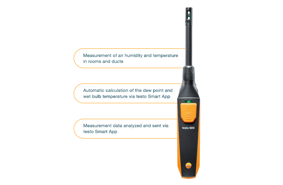 • Automatic calculation of the dew point and wet bulb temperature via testo Smart App