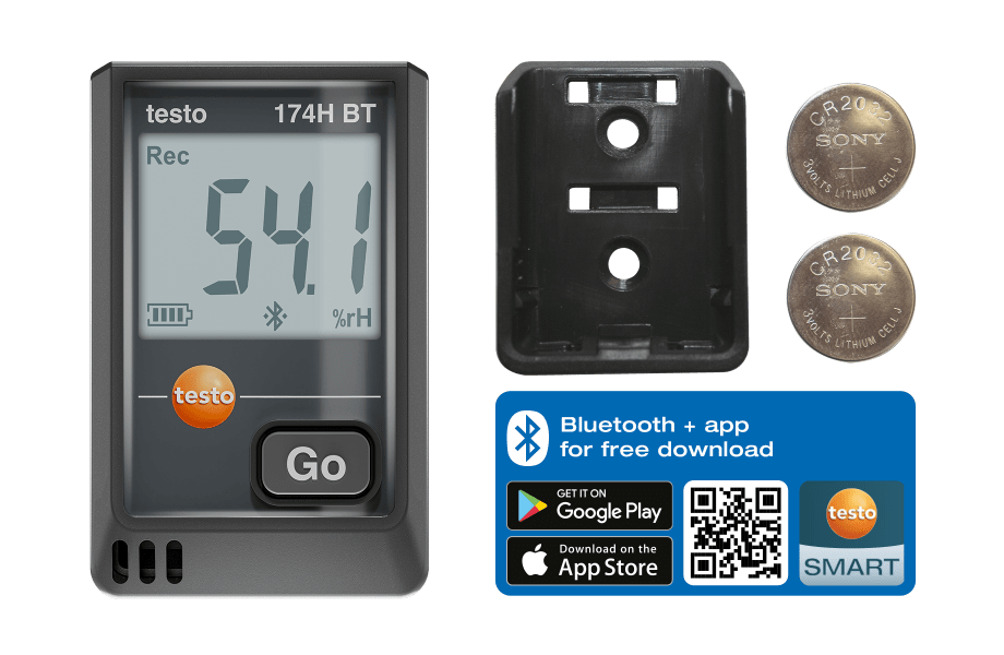 The testo 174 H BT mini data logger is ideal for efficient commissioning, inspection and maintenance of all HVAC/R systems, as well as for convenient fault diagnosis and monitoring of the indoor climate. It accurately measures temperature and humidity in the range -20 °C to +70 °C, displays current values and limit value violations and stores up to 16,000 readings. Simple configuration and evaluation of the data logger is carried out via the free testo Smart App, which enables intuitive reporting and data analysis via Bluetooth up to 30 metres away.