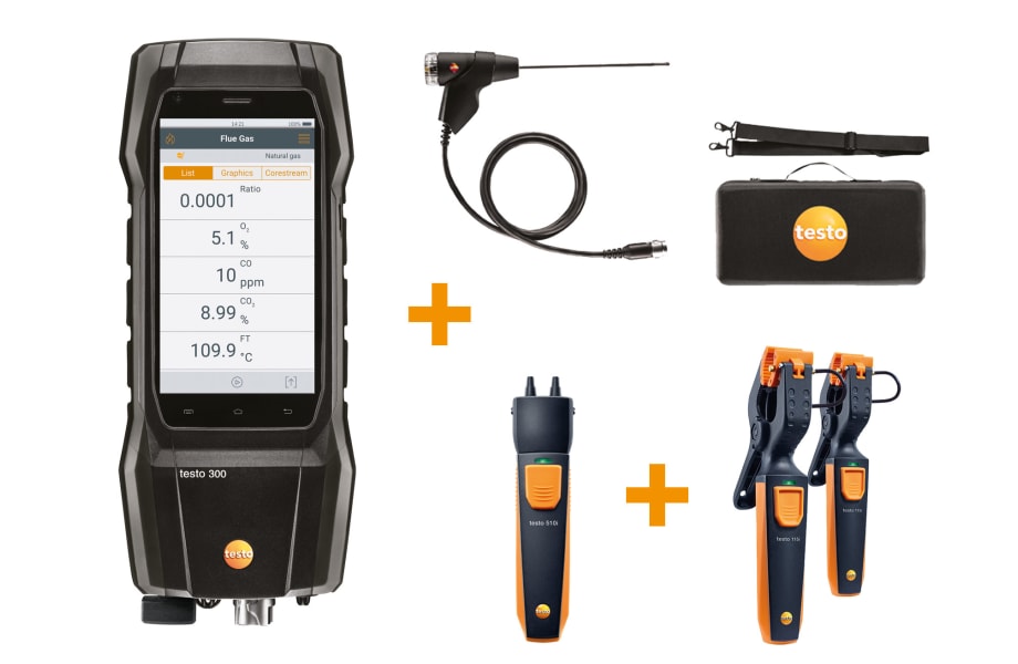 With this kit, you will be equipped to carry out smart measurements involving domestic heating systems, thanks to the bluetooth clamp probes and manometer included: the testo 300+ flue gas analyser is supplied with 5 year lifespan O2 and CO sensor (8,000 ppm H2 compensated), basic flue gas probe, testo Bluetooth® Connector, 1x testo 510i bluetooth differential manometer, 2 x testo 115i bluetooth pipe clamp thermometer, instrument carry case, AC USB power supply.