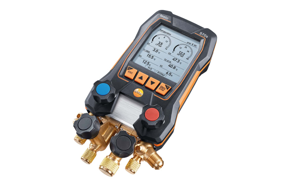 The testo 570s digital manifold with Bluetooth and 4-way valve block is the optimal solution for long-term measurements on refrigeration and air conditioning systems as well as heat pumps. Intelligent error analysis in the testo Smart App allows anomalies to be detected quickly and reliably. testo 570s boasts the world's longest runtime of up to 360 hours, a large data memory and a high degree of measuring accuracy, making it a reliable partner for both long-term and short-term measurements.