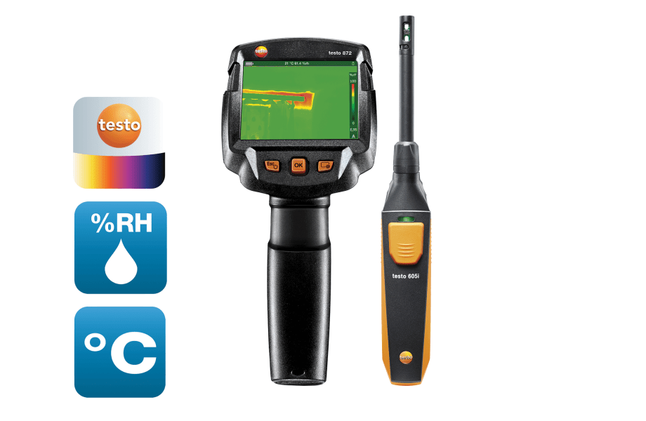 The testo 872s Building Diagnosis Kit is a complete solution for professional building inspections, combining advanced thermal imaging with real-time environmental measurements. The kit includes the testo 872s Thermal Imaging Camera (320 x 240 pixels), the testo 605i Smart Probe for precise humidity and temperature monitoring, and advanced mould detection technology. A smart traffic light indicator (green, amber, red) visually identifies areas at risk of mould formation. With Wi-Fi connectivity, Bluetooth integration, automatic hot/cold spot detection, and IP54-rated durability, this kit delivers fast, accurate, and reliable diagnostics for building professionals.