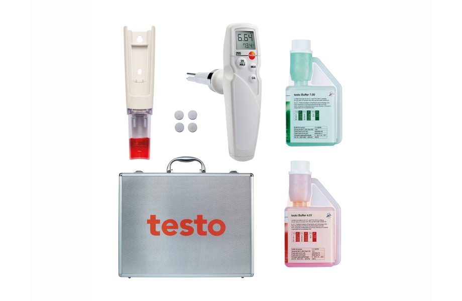 testo 205 pH temperature measuring instrument starter set, incl. storage cap with gel and calibration dosing bottles 250 ml pH 4 and 7, belt/wall bracket and aluminium case.