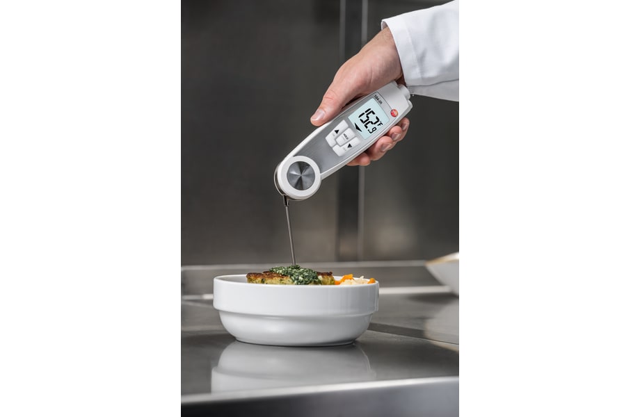 The temperature of food has a critical influence on product quality and consumer health. In order to ensure food safety and prevent the proliferation of germs, it is necessary to monitor food temperatures. During transport, upon receipt and throughout storage, make sure that cooling compliance is uninterrupted by using both infrared and core temperature measuring technology. The testo 104-IR infrared and penetration thermometer helps you do this. This instrument offers:
