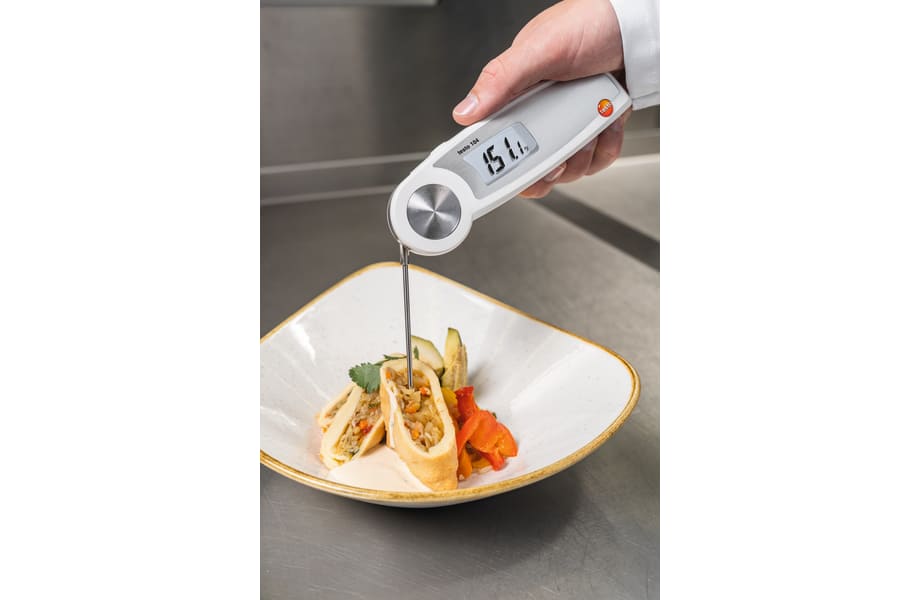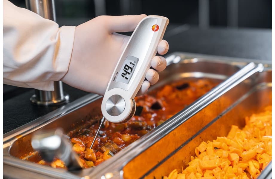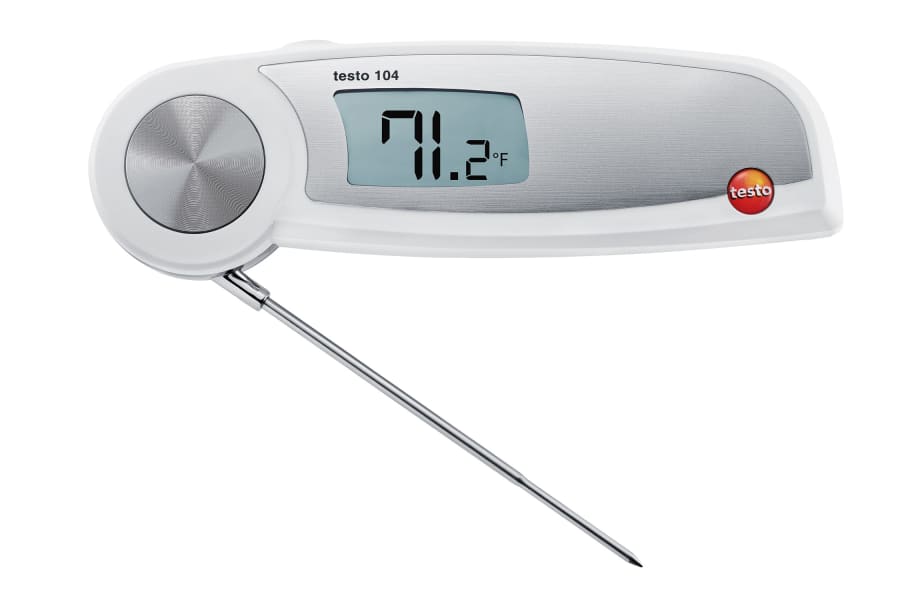 The testo 104 waterproof food probe thermometer comes with a wide range of features including a strong foldable form factor, a rubber-coated anti-slip surface, color coded markers to prevent cross contaminiation, and a long, precise temperature probe that make it ideal for use in the food industry.