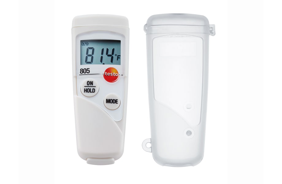 Its small size (80 mm long) makes the infrared thermometer particularly practical, fitting into any pocket and always on hand. Its 1:1 optics system means it is suitable for close-up temperature measurements. At the touch of a button, the Testo infrared thermometer measures the surface temperature of the object being measured without coming into contact with it. If you need to measure the temperature of entire pallets of goods or refrigerated sections you can use scan mode for continuous measurement.The scope of delivery of the testo 805 infrared thermometer includes the TopSafe protective case. This protects the measuring instrument from dirt and water in accordance with protection class IP 65. This protective case is of great benefit, e.g. in the food sector (e.g. food controls), where a humid environment and spray water can be expected.