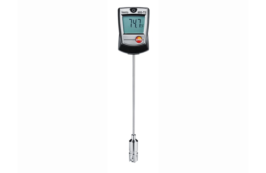 The testo 905-T2 surface thermometer also impresses with its large measuring range of -50 to +350 °C. Measurements of up to +500 °C are also possible for a short period (1 to 2 minutes). Its large measuring range means that the temperature measuring instrument has many different uses, like in the area of heating, plumbing, or refrigeration technology. This surface thermometer is particularly well suited to temperature measurements on pipes, as its thermocouple probe is easily able to deal with their uneven surfaces.