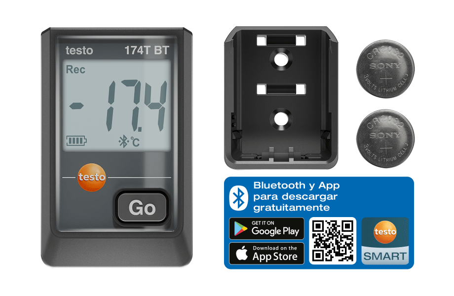 El mini registrador de datos testo 174 T BT mide temperaturas entre -30 °C y +70 °C y es ideal para la puesta en marcha, la comprobación y el mantenimiento de todos los sistemas HVAC/R. Con la App testo Smart, la configuración y la evaluación de datos es sencilla y gracias a Bluetooth se pueden leer valores medidos a una distancia de hasta 30 metros.