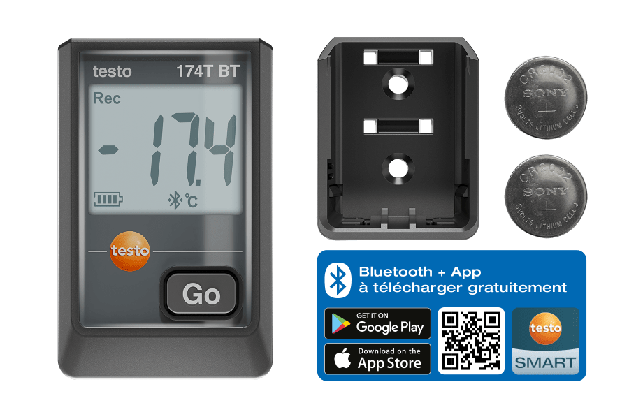 Le mini-enregistreur de données testo 174 T BT convient de manière idéale à la mise en service, au contrôle et à la maintenance efficaces de tous les systèmes CVC-R, ainsi qu’au diagnostic d’erreurs et à la surveillance du climat intérieur confortables. Il mesure la température à l’intérieur avec fiabilité dans l’étendue de mesure de -30 °C à +70 °C et offre une configuration aisée et intuitive ainsi que l’analyse des données de mesure via l’App testo Smart gratuite. L’App permet la documentation en continu et le respect de la réglementation grâce à des fonctions telles que la création de rapports et l’exportation des données. Grâce à la connexion Bluetooth, vous pouvez lire les données directement sur le lieu de mesure jusqu’à une distance de 30 mètres. En outre, l’enregistreur offre une sauvegarde automatique des données en cas de pile vide ou de changement de pile pour garantir la fiabilité des mesures.