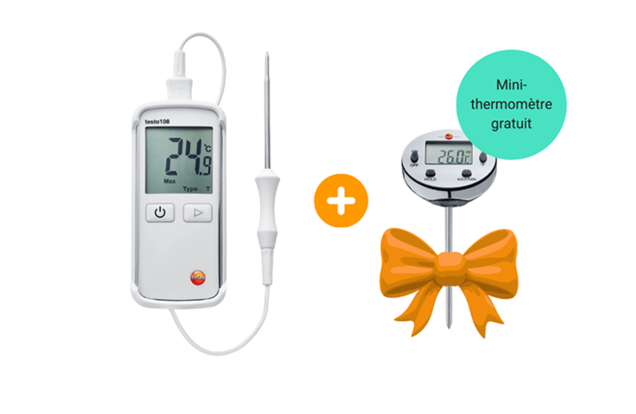 1 appareil de mesure de la température étanche testo 108 (TC de type T et K), avec sonde de température de pénétration (TC de type T), Softcase, piles et protocole d’étalonnage.