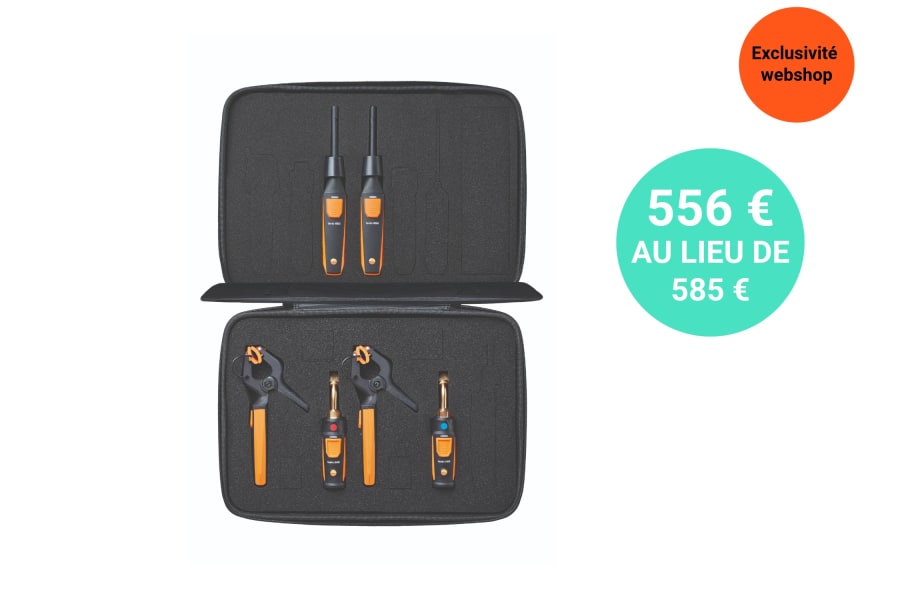 Pour frigoristes : le kit comprend respectivement deux manomètres haute pression testo 549i, thermo-hygromètres testo 605i et thermomètres à pince testo 115i. Associé à votre Smartphone/tablette, ce kit convient de manière idéale pour l’entretien, le dépannage et l’installation de systèmes de climatisation et frigorifiques. L’App testo Smart permet de travailler de manière plus simple et efficace : plus de 90 fluides frigorigènes enregistrés, calcul automatique de la surchauffe/du sous-refroidissement, surchauffe cible ainsi que puissance frigorifique/calorifique, envoi de protocoles de données de mesure directement par e-mail comme fichier PDF ou Excel.