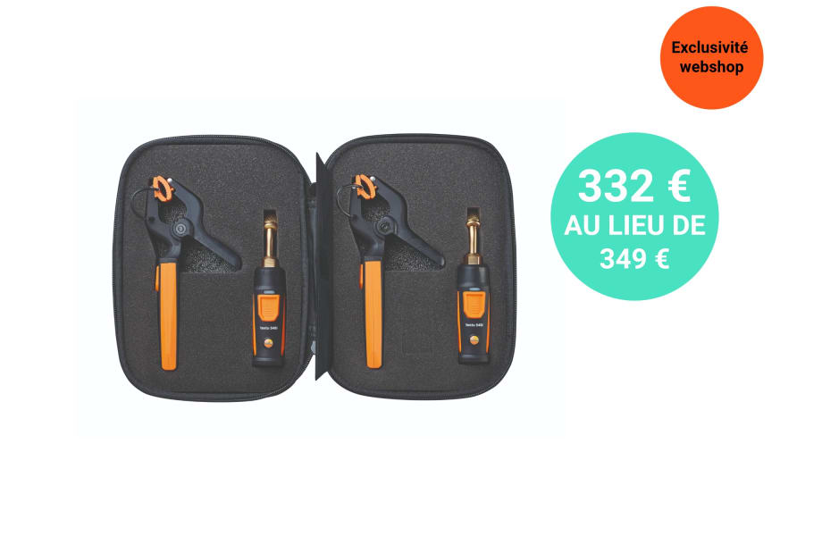Dans le kit : 2 thermomètres à pince Testo 115i, 2 manomètres haute pression Testo 549i, étui souple Testo HVAC