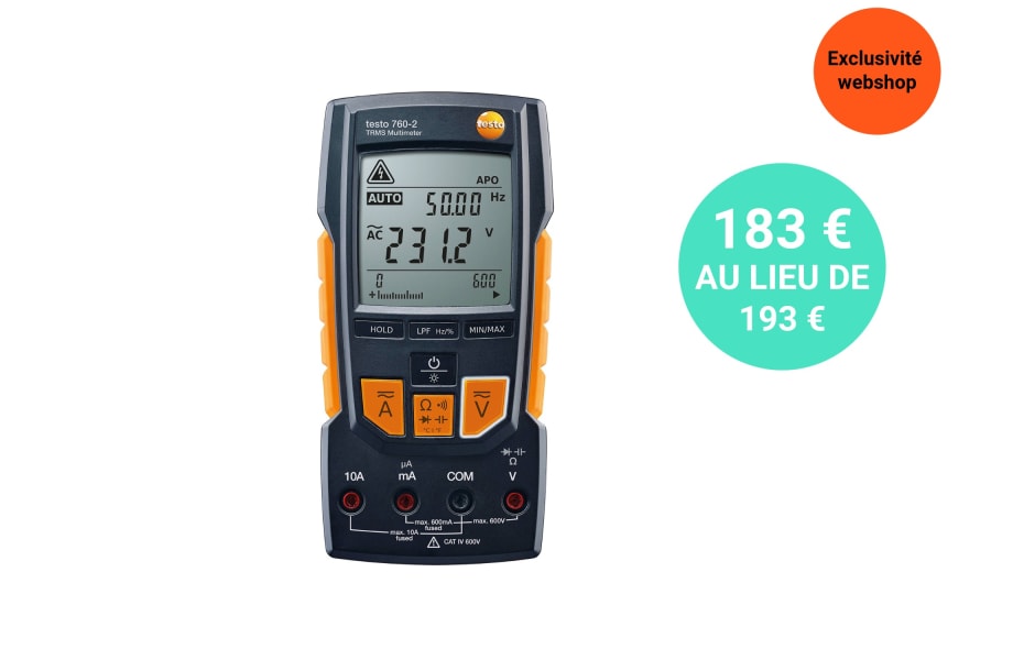 Le multimètre digital testo 760-2 est un appareil polyvalent pour toutes les tâches de mesure électriques importantes. Grâce à l'identification automatique des grandeurs de mesure, il garantit la plus grande sécurité possible lors de chaque utilisation. Avec ce multimètre digital, vous pouvez également mesurer des intensités de courant de l'ordre du µA et déterminer la valeur effective réelle.