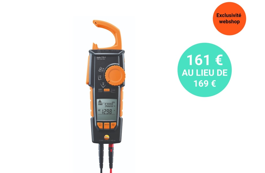 Pince ampèremétrique TRMS testo 770-1, avec pile, 1 jeu de câbles de mesure (0590 0010), mode d’emploi.