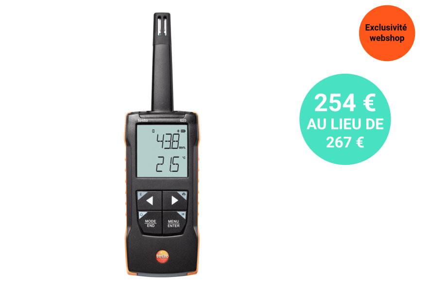 L’humidité relative de l’air et la température de l’air sont deux facteurs déterminants, p. ex. pour évaluer la qualité de l’air intérieur et le confort thermique. Si vous voulez donc garantir que les gens se sentent à l’aise dans les pièces à l’intérieur ou qu’il y a des conditions optimales dans les locaux de stockage, le thermo-hygromètre testo 625 est le choix idéal. Pour fournir des résultats précis le plus rapidement et le plus simplement possible, le testo 625 calcule non seulement le point de rosée et la température du bulbe humide automatiquement. Il affiche également tout de suite les moyennes temporelles et multipoints. Et l’App testo Smart vous permet de tirer le meilleur profit du thermo-hygromètre: