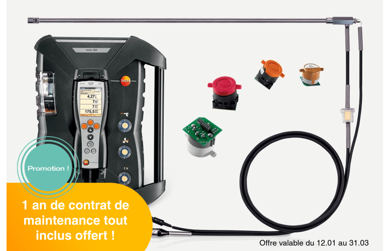 • Proposition de commande recommandée : Unité de contrôle testo 350, coffret d’analyse avec capteurs de gaz de O2 LL, COH2, CO2 NDIR, NO, système de préparation des gaz Peltier, module Bluetooth®, bloc d’alimentation, mallette de transport ainsi que logiciel PC easyEmission