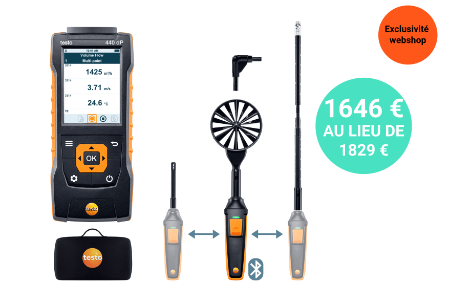 Mesurer sans câble gênant : ce kit vous permet de réaliser toutes les mesures importantes dans les canalisations d’air et aux sorties d’air/plafonnières. Vous recevez l’analyseur de climat testo 440 dP avec capteur de pression différentielle, deux têtes de sonde à hélice (Ø 100 mm et Ø 16 mm) ainsi qu’une tête de sonde d’humidité et de température – les trois se montent sur la poignée Bluetooth universelle fournie. Les deux têtes de sonde à hélice peuvent être associées au télescope compris dans le kit pour permettre des mesures plus confortables. La mallette robuste permet un transport confortable et sûr de tout l’équipement.