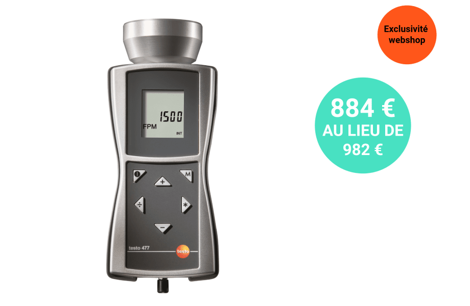 Stroboscope LED testo 477 avec mallette de transport, prise de déclenchement, pile et protocole d'étalonnage.