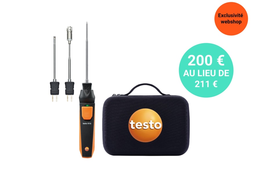 Le kit de température testo 915i avec sondes de température offre tout ce qu’il faut pour des mesures de température plus rapides, plus flexibles et plus simples : il comprend un thermomètre testo 915i connecté, une sonde d’ambiance, une sonde d’immersion/de pénétration ainsi qu’une sonde de contact rapide (toutes les sondes : TC de type K, classe. La poignée est compatible avec toutes les sondes thermocouples de type K du marché, afin de garantir une utilisation des plus polyvalente. Grâce à la liaison Bluetooth et à l’App testo Smart, le pilotage, l’analyse et la documentation sont particulièrement faciles et flexibles.
