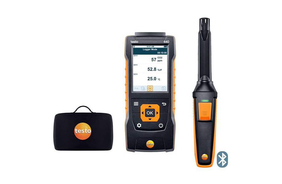 Kit per valutare la qualità dell'aria ambiente (IAQ - Indoor Air Quality). Il kit comprende lo strumento per misure ambientali testo 440 e la sonda CO2 con Bluetooth, incl. sensore termoigrometrico, il tutto sistemato al sicuro nella pratica valigetta. Così potrai iniziare subito a lavorare!