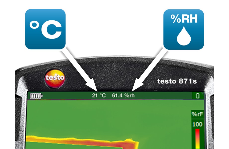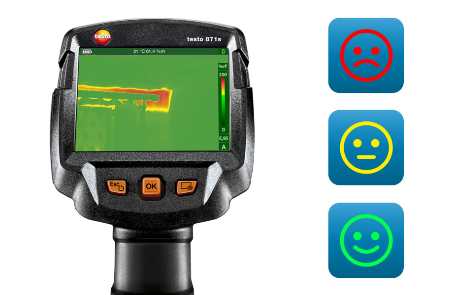 Identifica il rischio di muffa in modo facile e affidabile: il termoigrometro testo 605i misura la temperatura e l'umidità ambiente e trasmette le letture in tempo reale tramite Bluetooth alla termocamera. La termocamera a infrarossi misura la temperatura della superficie e calcola l'umidità relativa della superficie utilizzando le letture del termoigrometro. L'umidità relativa della superficie viene visualizzata sul display come un'immagine dell'umidità – le aree a rischio di muffa sono indicate tramite colori a semaforo.