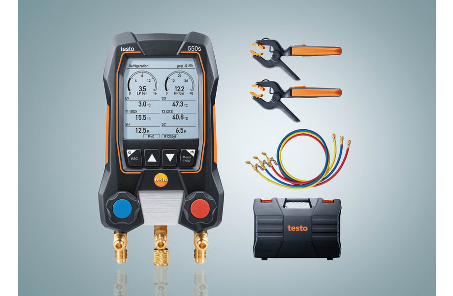 De set voor draadloze metingen op het gebied van inbedrijfstelling, service en onderhoud rondom koelsystemen, airconditionings en warmtepompen: U krijgt de slimme digitale manifold testo 550s incl. bluetooth, 2-weg-ventielblok, twee draadloze tangthermometers testo 115i (bluetooth, NTC), een set van 3 vulslangen en een stevige transportkoffer. Verdere bluetooth-voelers, bijv. voor de draad- en slangloze meting met testo 552i, zijn apart verkrijgbaar.