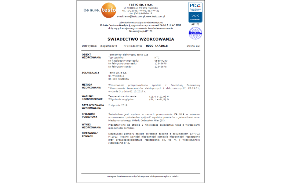 - wzorcowanie wykonane przez akredytowane przez PCA Laboratorium Pomiarowe Testo w punktach:(-10; 0; +20)°C dla czujników temperatury (temperatura powietrza lub zanurzeniowo/ penetracyjnych)