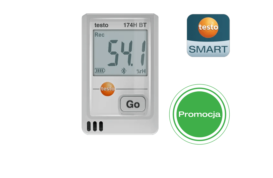 Mini rejestrator testo 174 H BT niezawodnie monitoruje towary wrażliwe na temperaturę i wilgotność w zakresie pomiarowym od -20°C do +70°C i przechowuje do 16 000 odczytów. Konfiguracja i ocena są łatwe dzięki bezpłatnej aplikacji testo Smart App.
