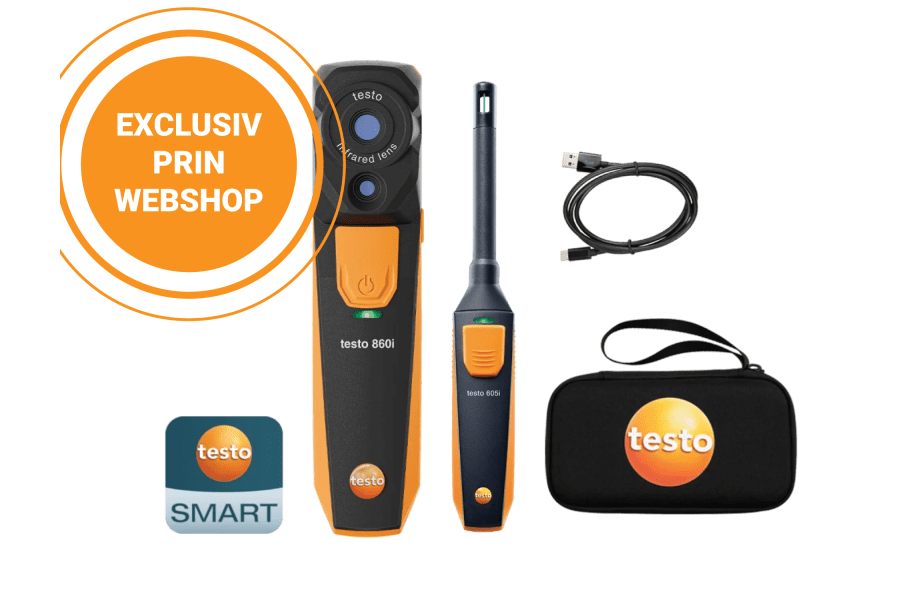 Setul pentru mucegai testo 860i combină camera de termoviziune pentru mobil testo 860i și termohigrometrul testo 605i pentru a oferi o soluție completă pentru detectarea riscului de apariție a mucegaiului. Datorită imaginii în infraroșu de înaltă rezoluție a camerei de termoviziune și conectivității la telefonul mobil prin intermediul aplicației testo Smart, aceasta permite analiza în timp real, documentarea și raportarea rezultatelor chiar de la locul măsurării. Acest set robust cu clasă de protecție IP54 asigură măsurători precise și conformitatea cu reglementările, fiind ideal pentru inspecții ale clădirilor cât și pentru prevenirea riscului de apariție a mucegaiului.