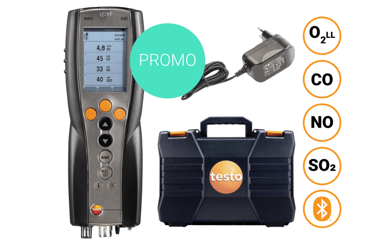 Analizorul de gaze de ardere testo 340 inclus în acest set este echipat cu senzori O2, CO(H2), NO și SO2, având asftel configurația optimă pentru măsurători la sistemele de încălzire pe combustibil gazos, lichid și solid.