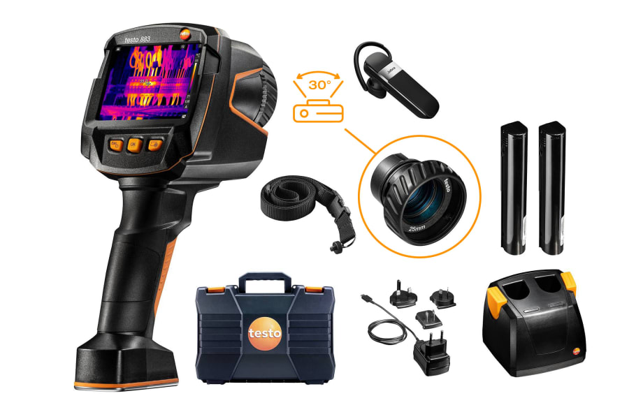 Setul perfect pentru termografie: camera de termoviziune testo 883-1 oferă cea mai bună calitate a imaginii, plus caracteristici utile pentru gestionarea imaginii, ajustarea contrastului și documentare. Bucurați-vă de avantajele pe care setul le oferă. Datorită lentilelor telephoto 12° x 9°, a bateriei de rezervă și stației de încărcare a bateriei, veți fi gata să începeți imediat și echipat în mod ideal - chiar și pentru efectuarea de măsurători la distanțe mai mari și pentru aplicații lungi de măsurare.