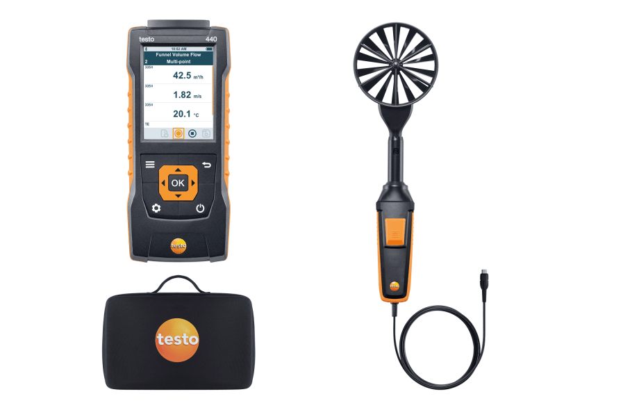 testo440 多参数,多元化配置, 多形态测量的仪器, 内置的标准测量程序可提供直观的测量操作,数据完整,适用于不同规格的通风空调系统检测及不同需求的室内空气质量,舒适度评估。